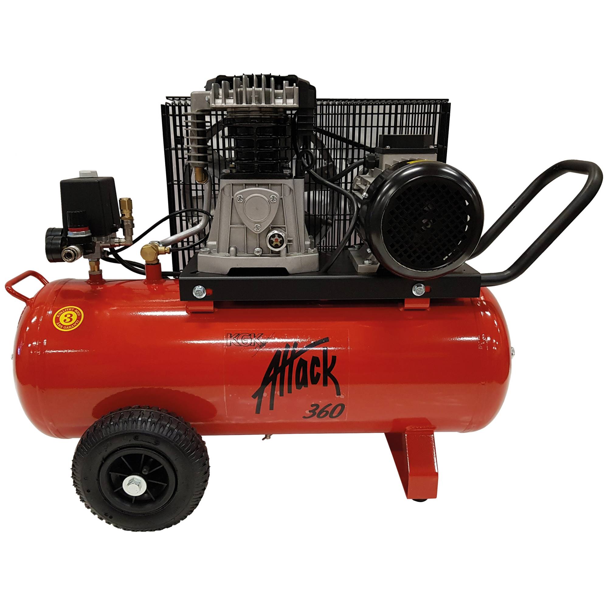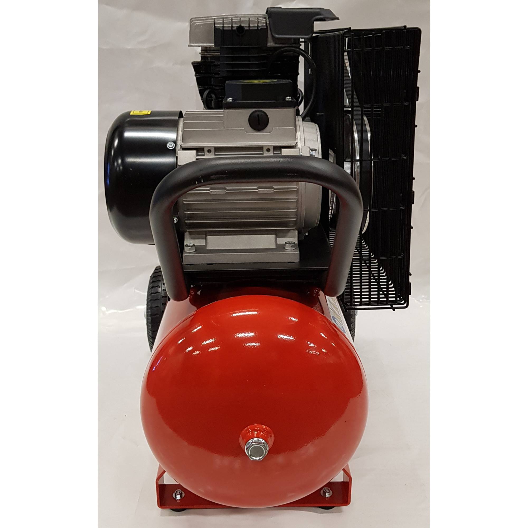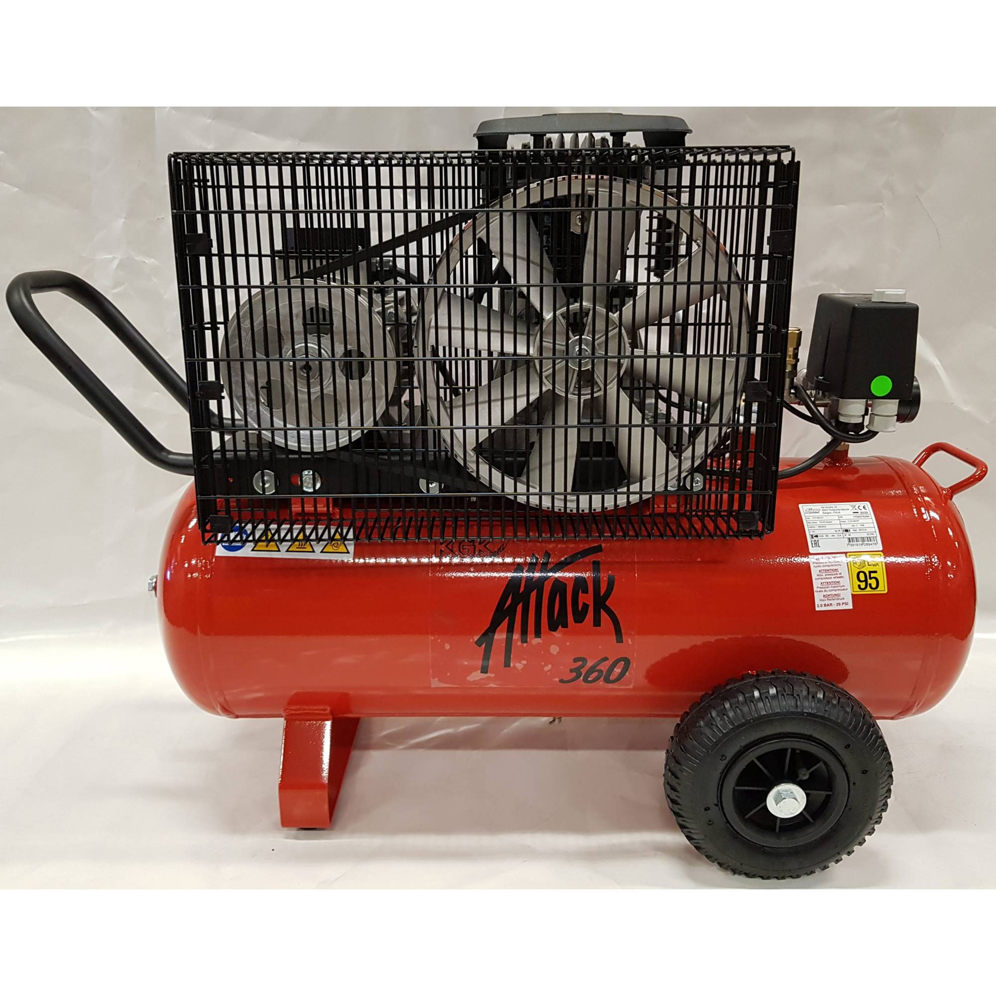 2-cylindrig, remdriven kompressor, där remskivan på kompressordelen har fläktvingar för bra kylning. Lågt varvtal. Kompressorn är utrustad med tryckströmbrytare, manometer, säkerhetsventil, reduceringsventil, snabbkoppling och hjul.