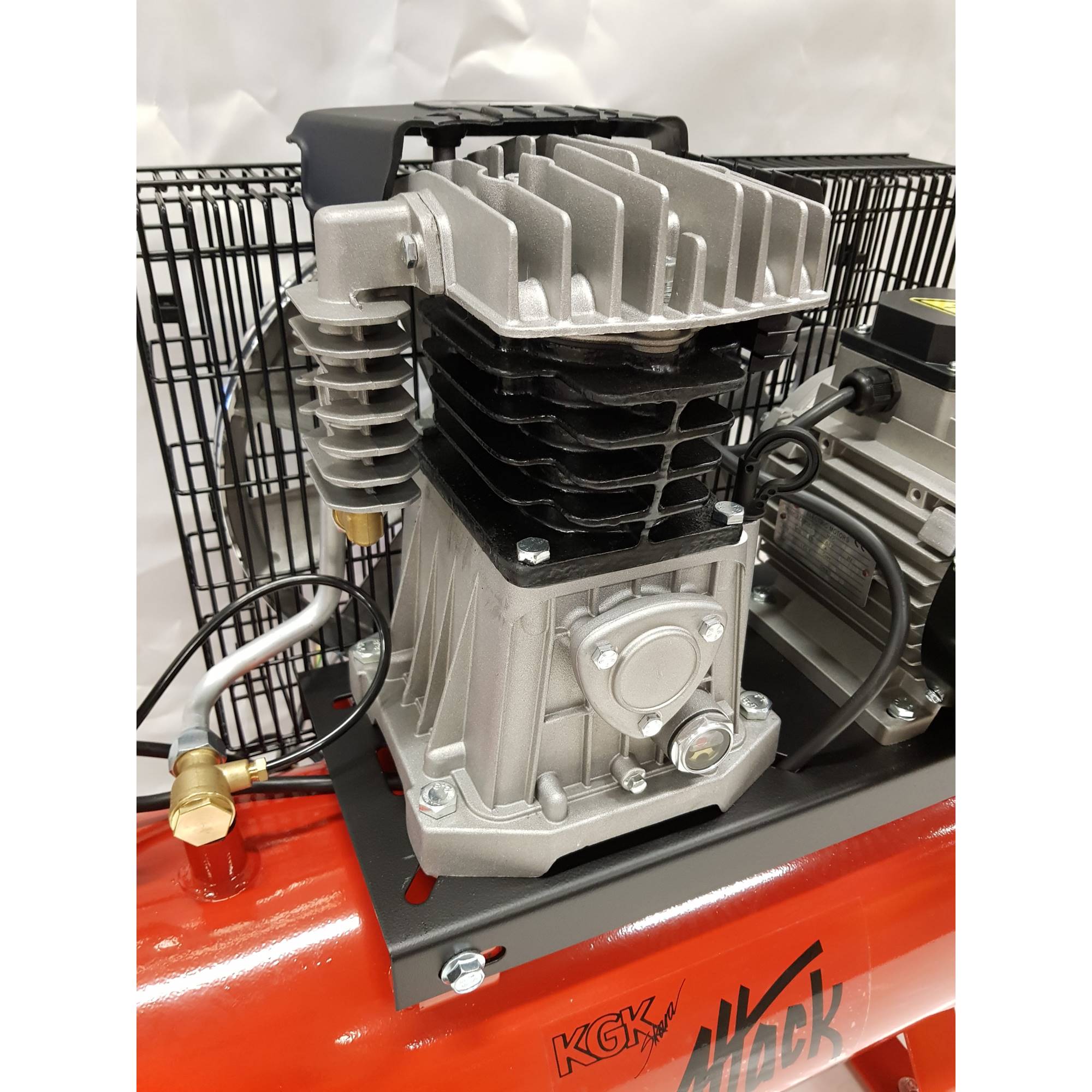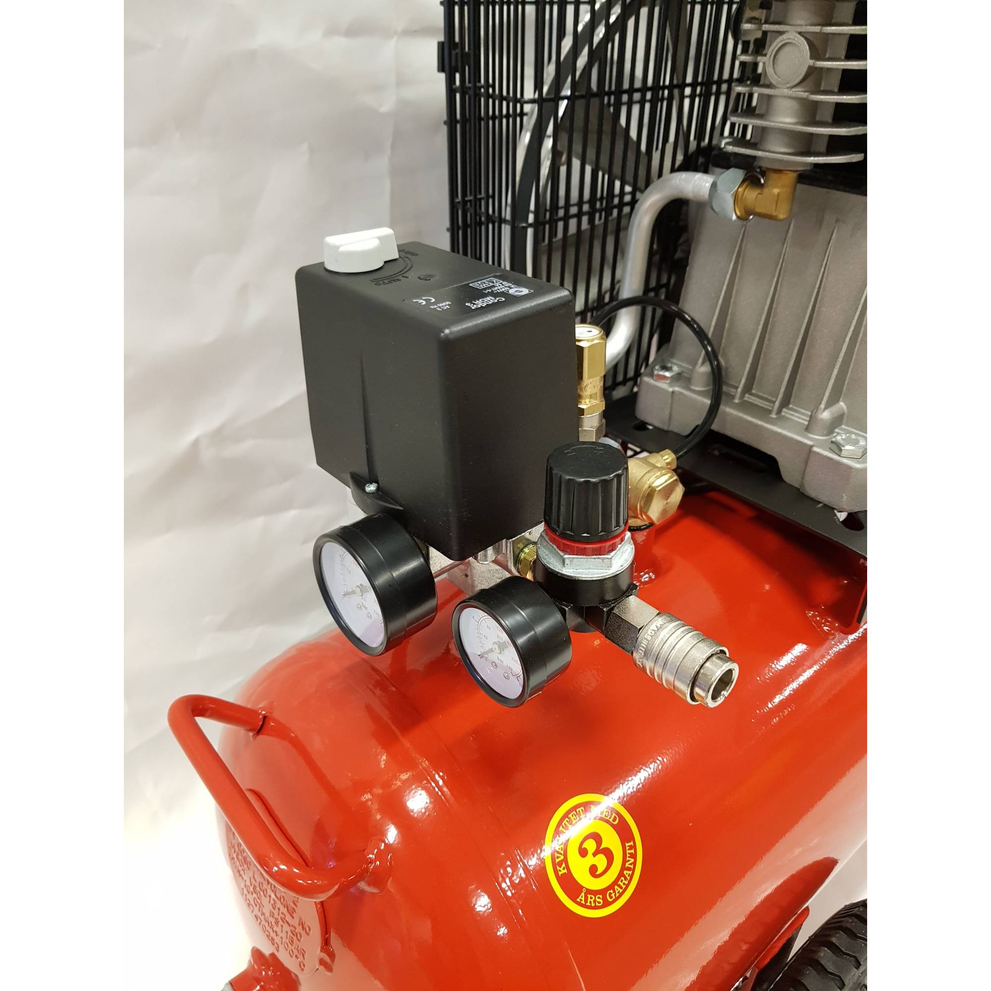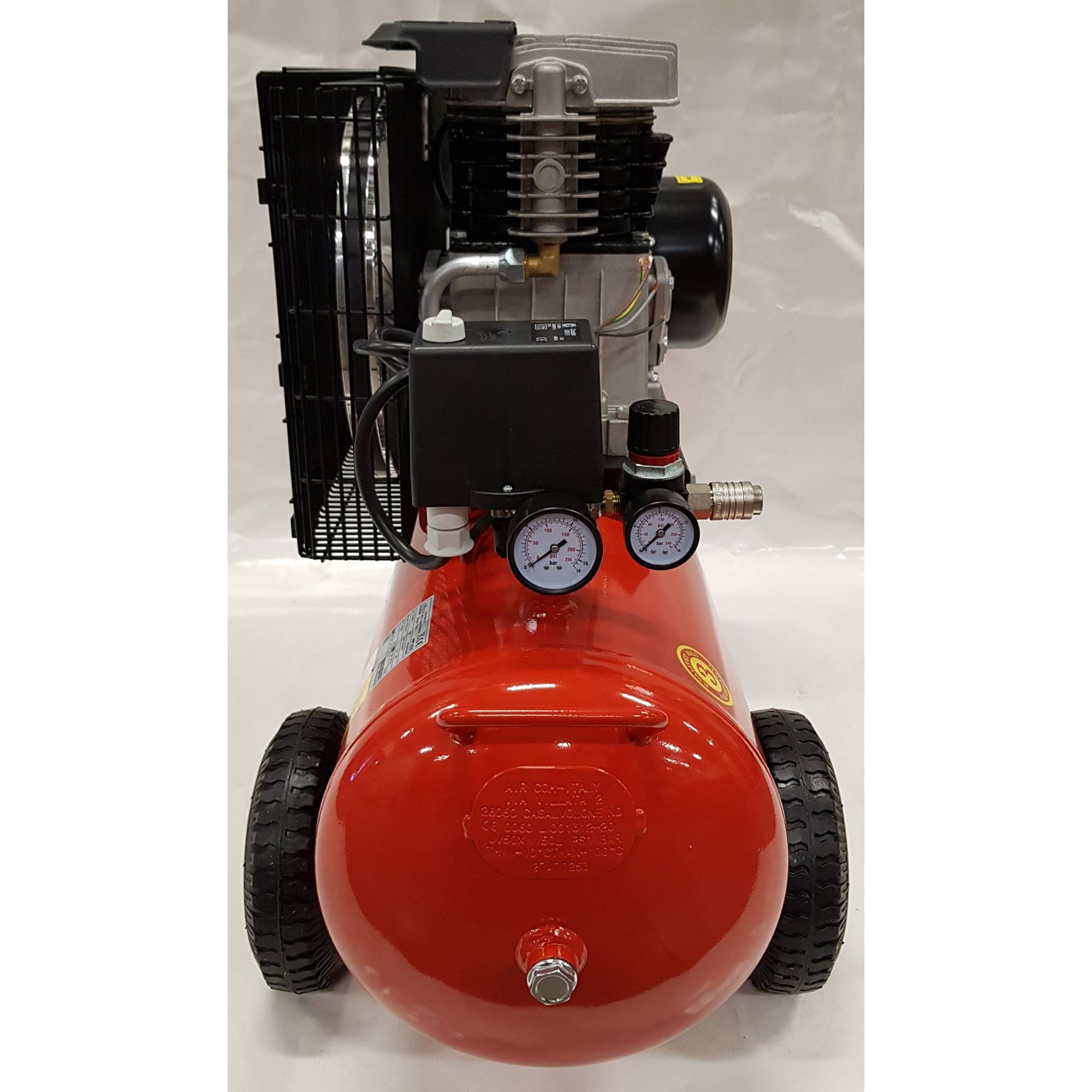 2-cylindrig, remdriven kompressor, där remskivan på kompressordelen har fläktvingar för bra kylning. Lågt varvtal. Kompressorn är utrustad med tryckströmbrytare, manometer, säkerhetsventil, reduceringsventil, snabbkoppling och hjul.