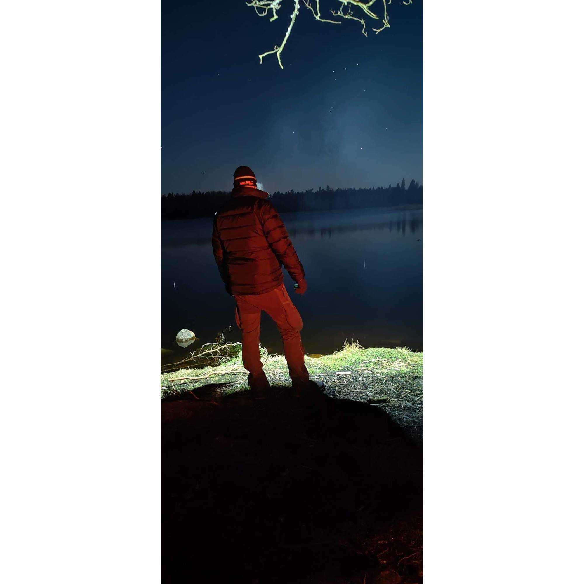 • Högeffektiv pannlampa med vidvinkelljus och töjbart justerbart pannband med reflex-remsor.