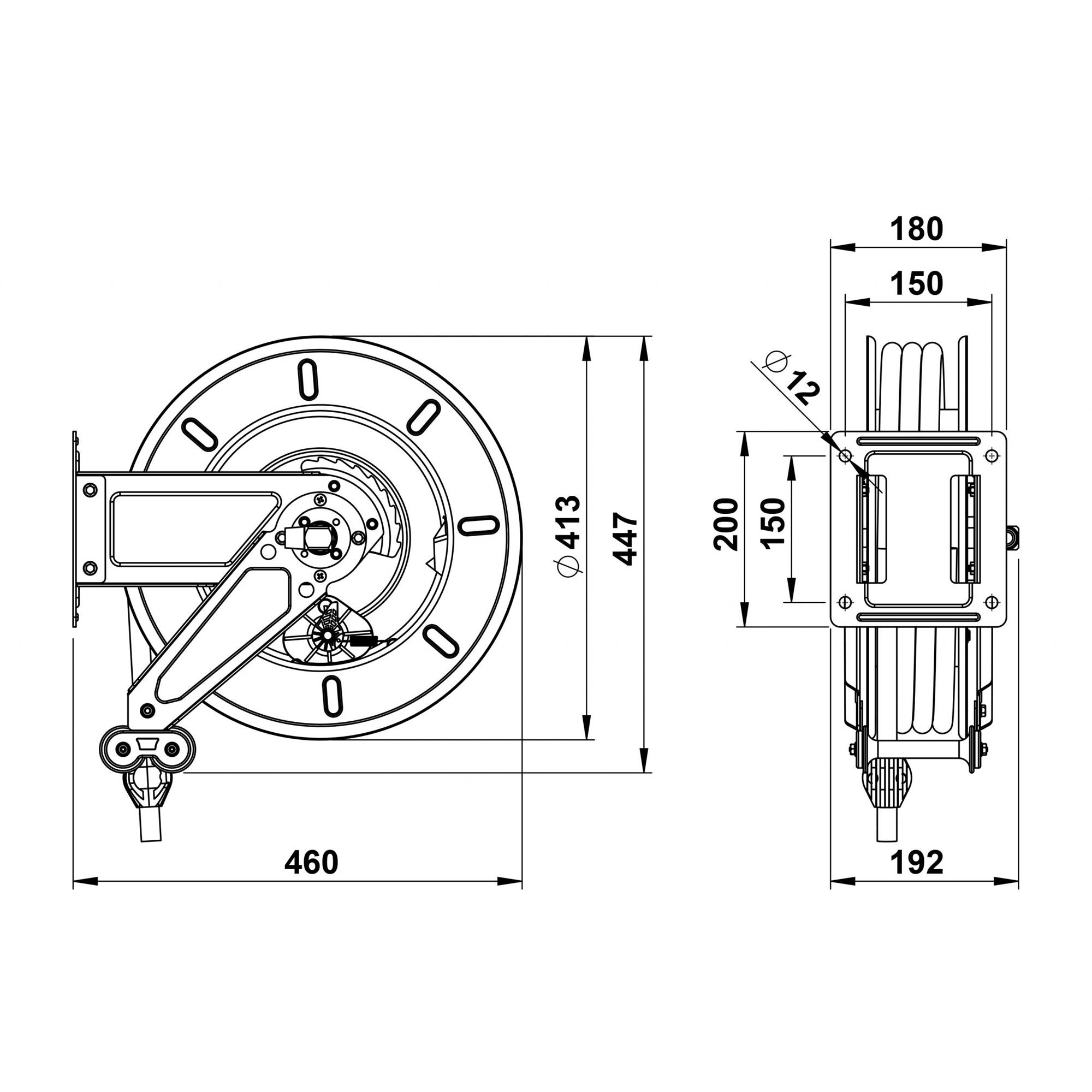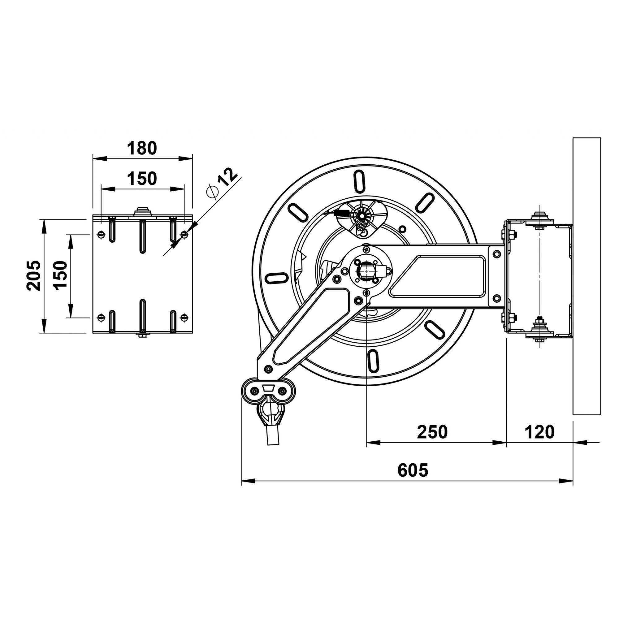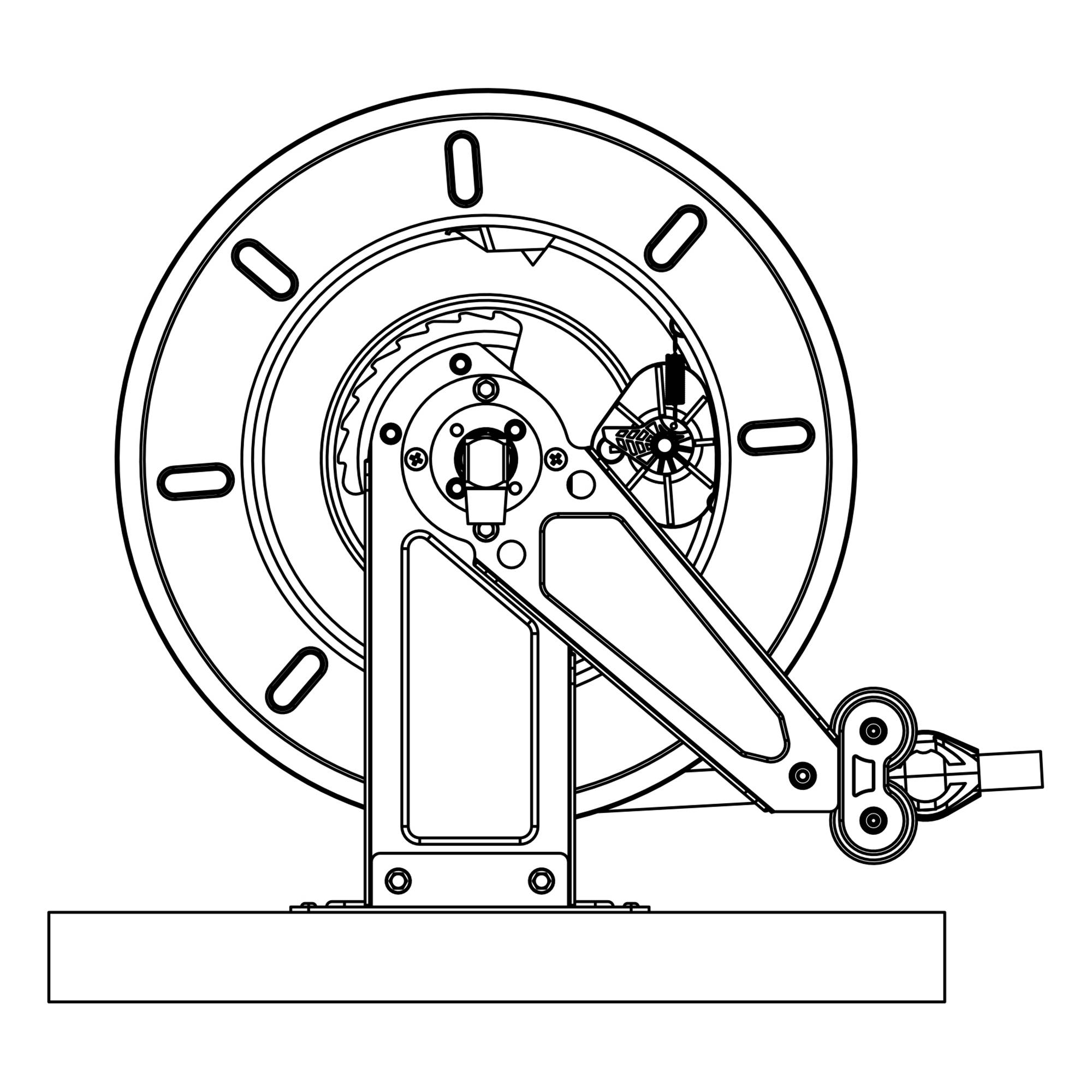 Slangvinda försedd med ställbara utmatningsarmar. Lätt att placera, även i trånga utrymmen. Kan även takmonteras. Vindan är pulverlackerad och utrustad med returfjäder. Kan kompletteras med svängbart väggfäste om slangen skall dras ut eller matas in i sidled. Slitaget på vindan blir mindre och slangen rullas upp jämnare. Oljebeständig gummislang.