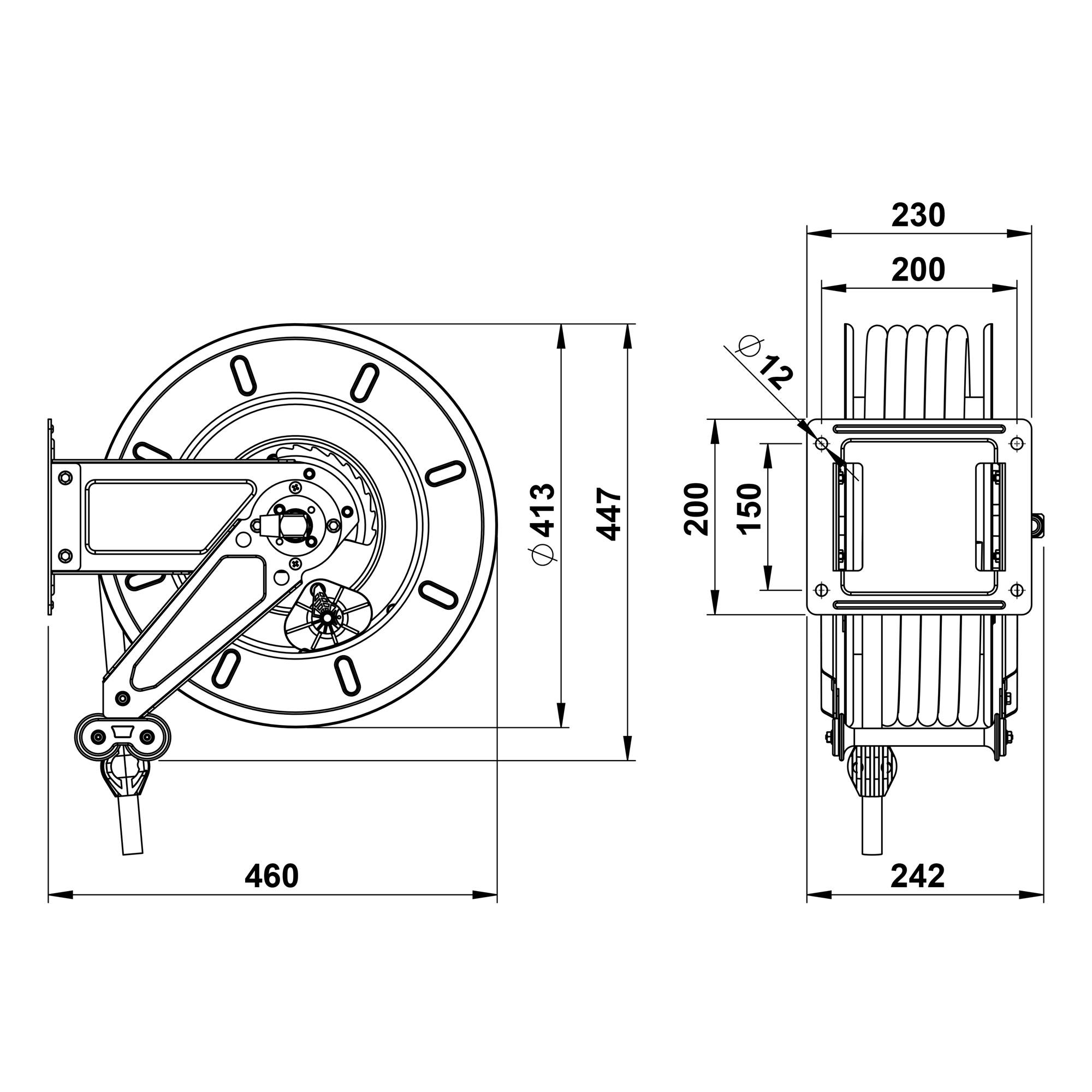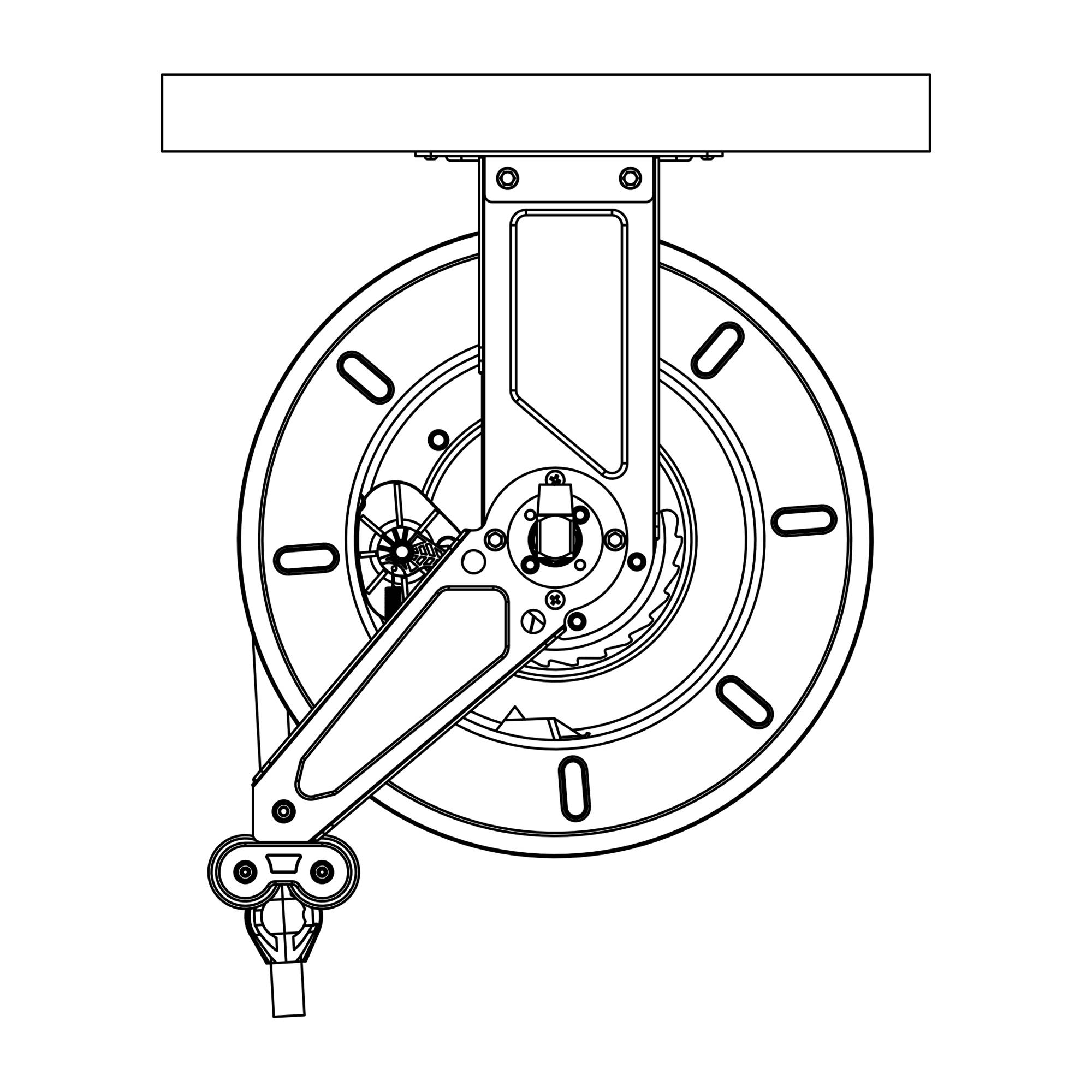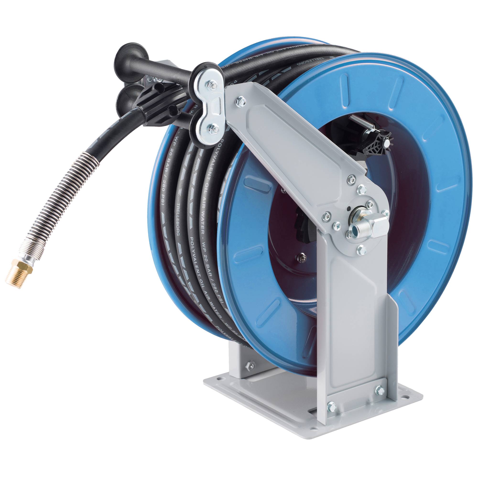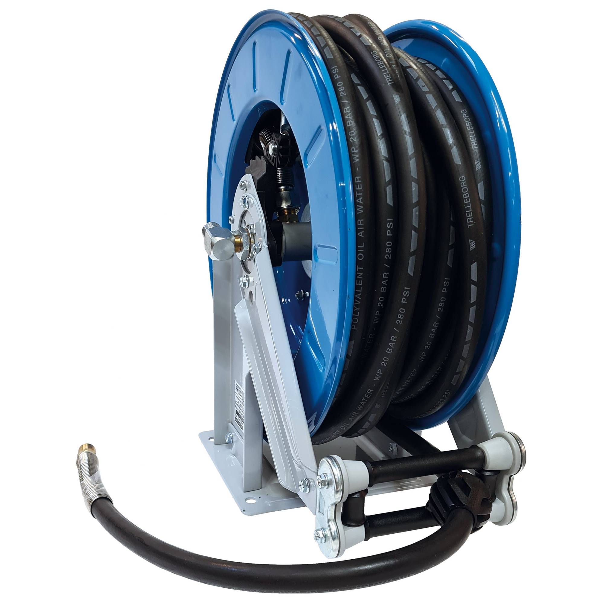 Slangvinda försedd med ställbara utmatningsarmar. Lätt att placera, även i trånga utrymmen. Kan även takmonteras. Vindan är pulverlackerad och utrustad med returfjäder. Kan kompletteras med svängbart väggfäste om slangen skall dras ut eller matas in i sidled. Slitaget på vindan blir mindre och slangen rullas upp jämnare.  Oljebeständig gummislang.