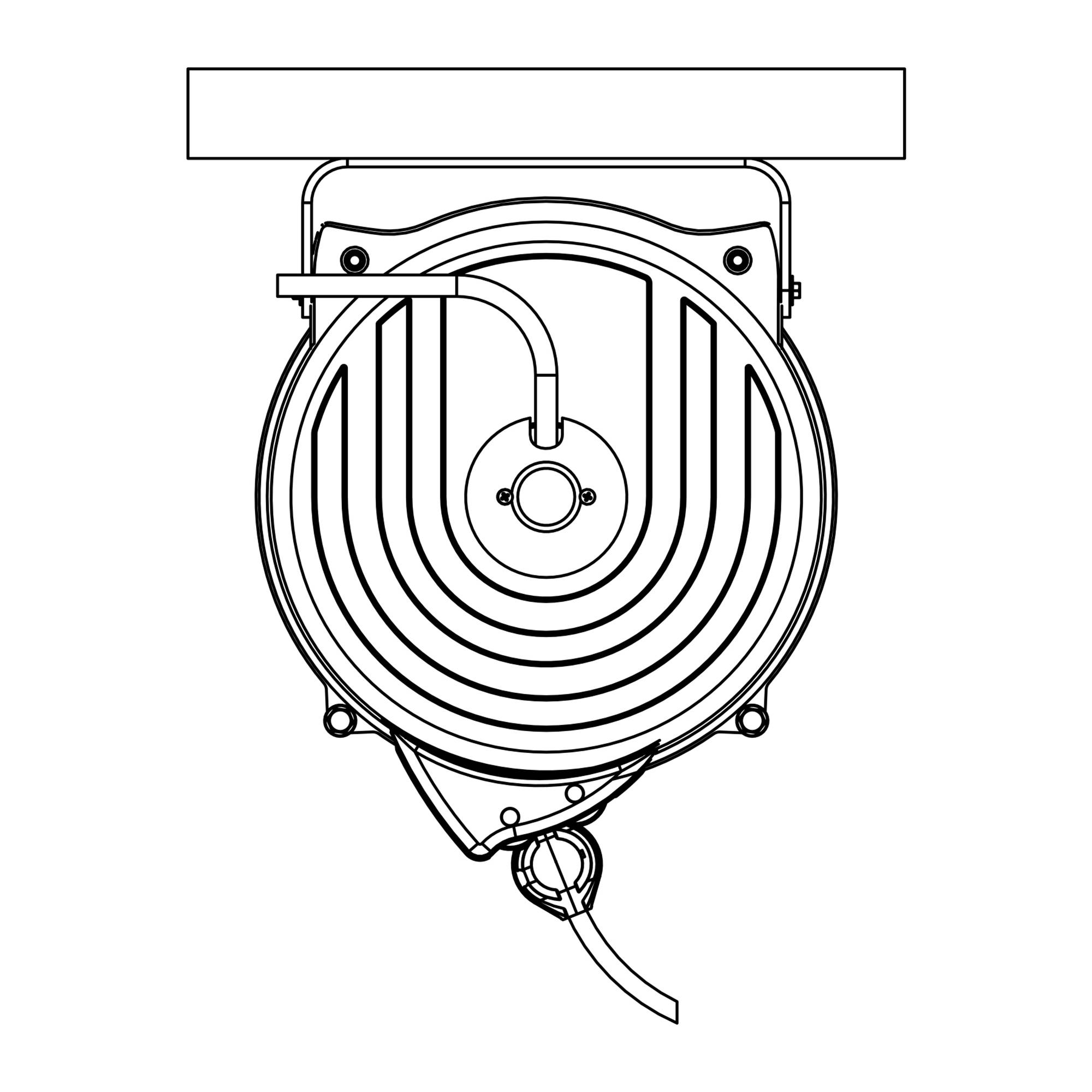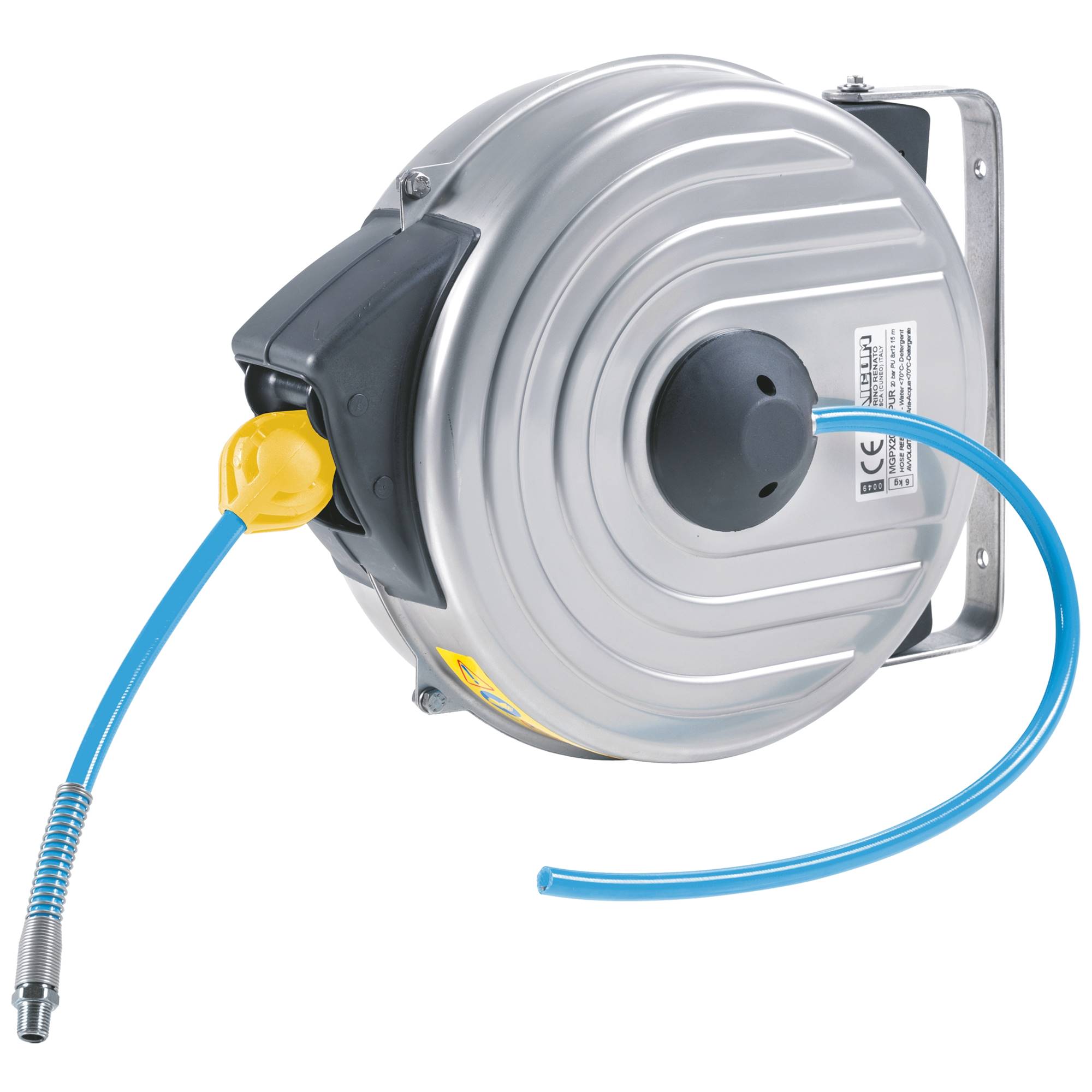 Kapslade vindor, rostfria, med livsmedelsslang utrustade med returbroms för kontrollerad inrullning. Max temperatur 70 °C. Levereras med svängbart väggfäste.