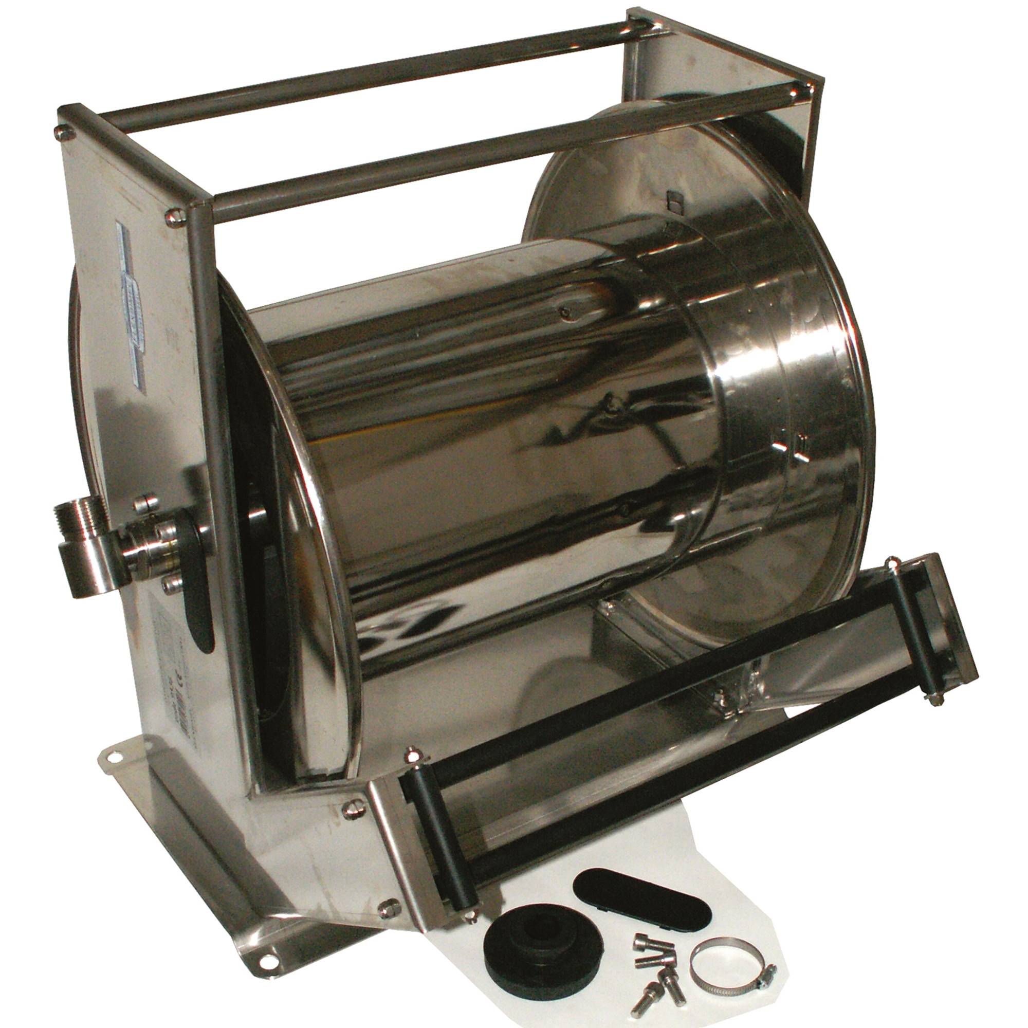 Automatisk återfjädrande slangvina. Levereras med slangstopp. Svirveln tål 150 ˚C. Rostfri.