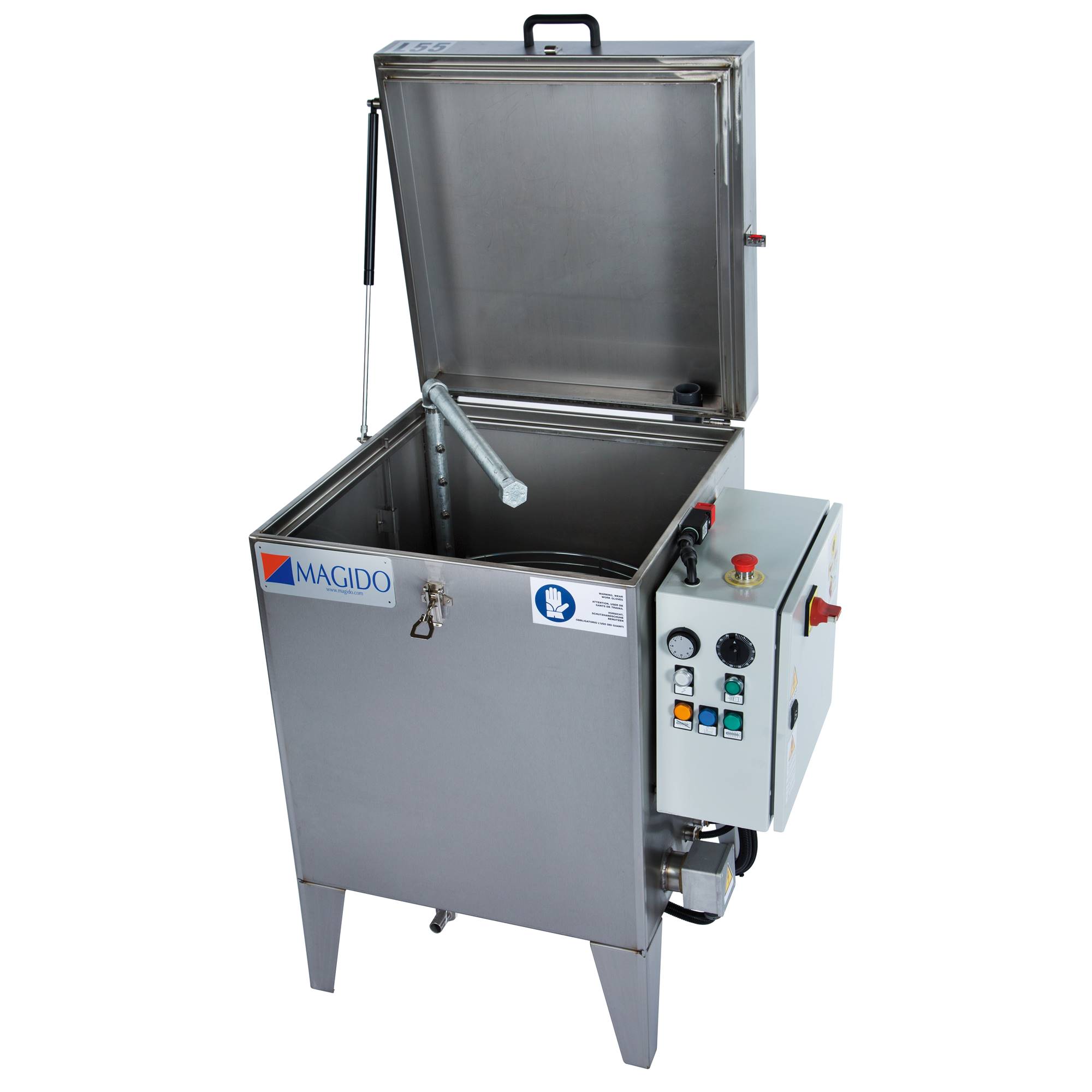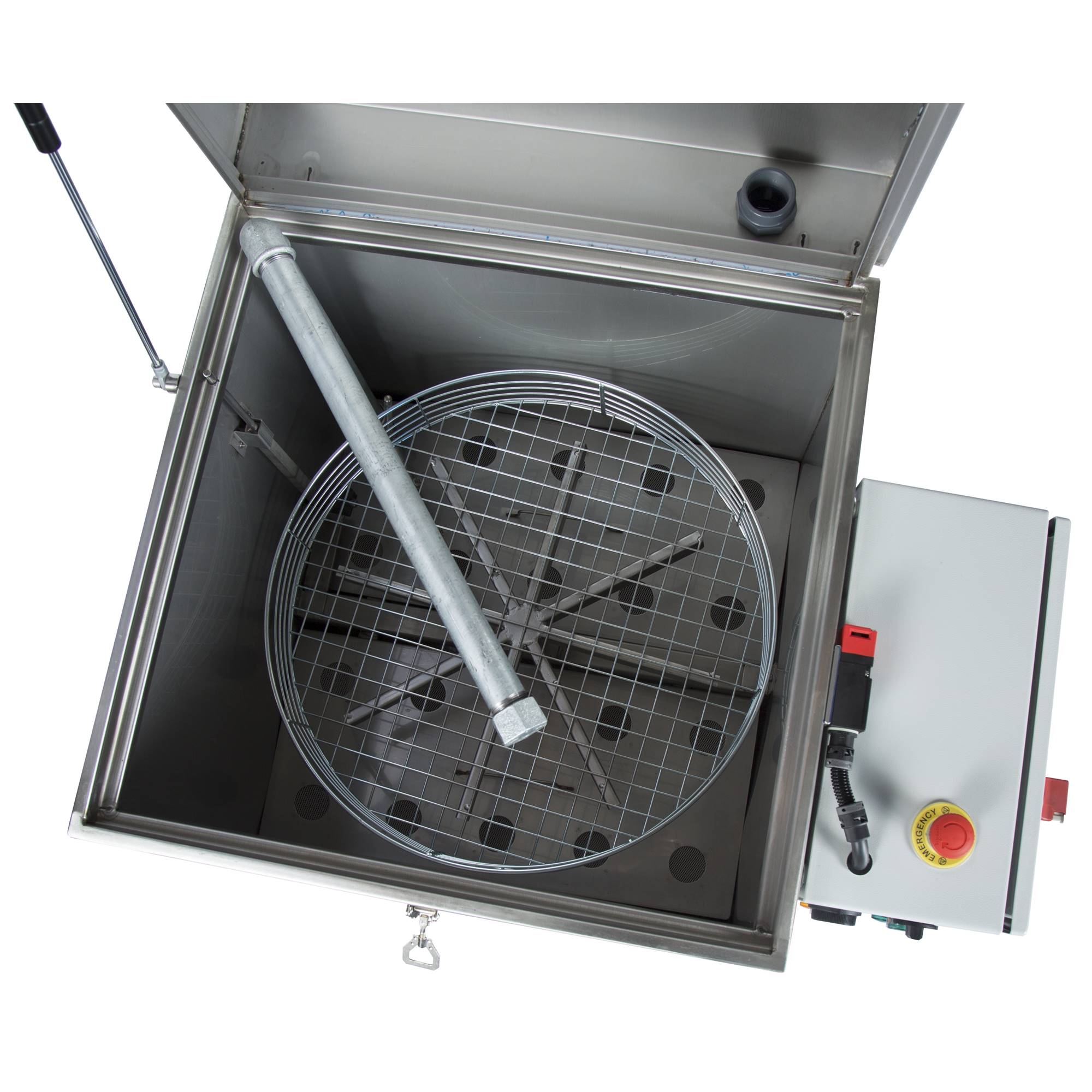 Automatisk smådelstvätt i rostfritt stål med värme. Spolröret med dysor är fast. Godskorgen roterar.