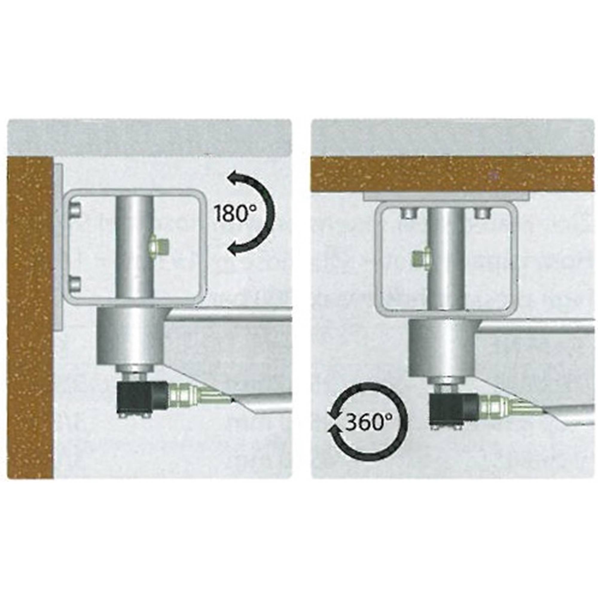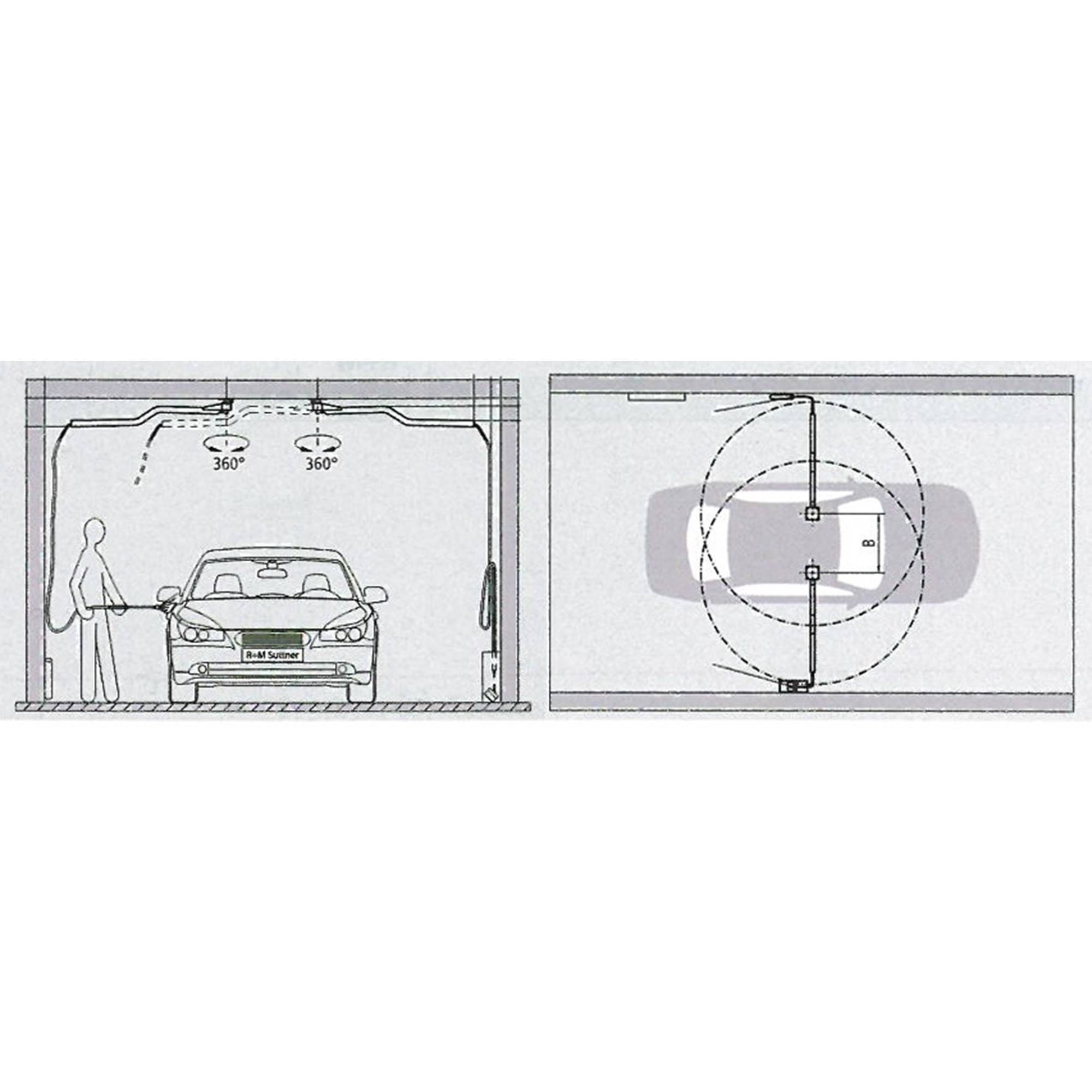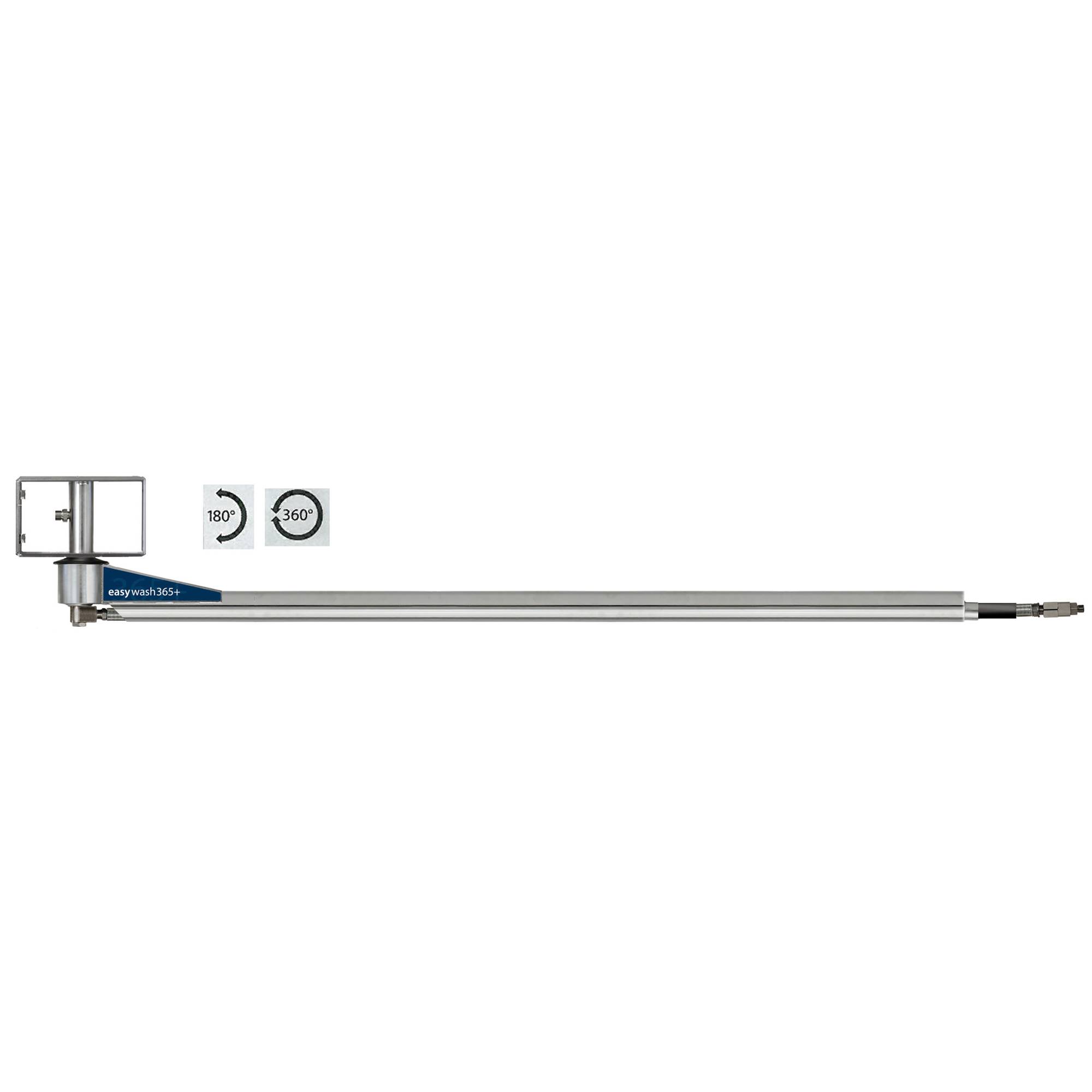Rostfri tvätthallsbom med kullagrad högtryckssvirvel. Fästet är för tak- eller väggmontering.